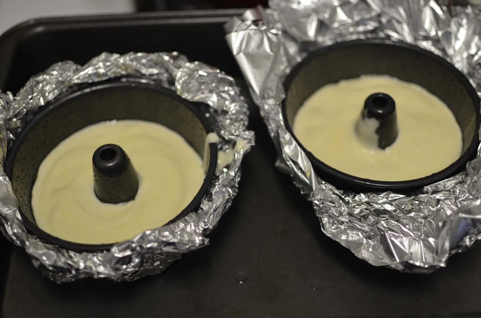 Pour the mixture into your cake pans that have parchment paper. Fill the outside pan with the hot water from your double boiler until half of the cake pan is touching water. BE VERY CAREFUL CARRYING THIS TO THE OVEN. It will be heavy and you don't want to spill hot water on yourself.